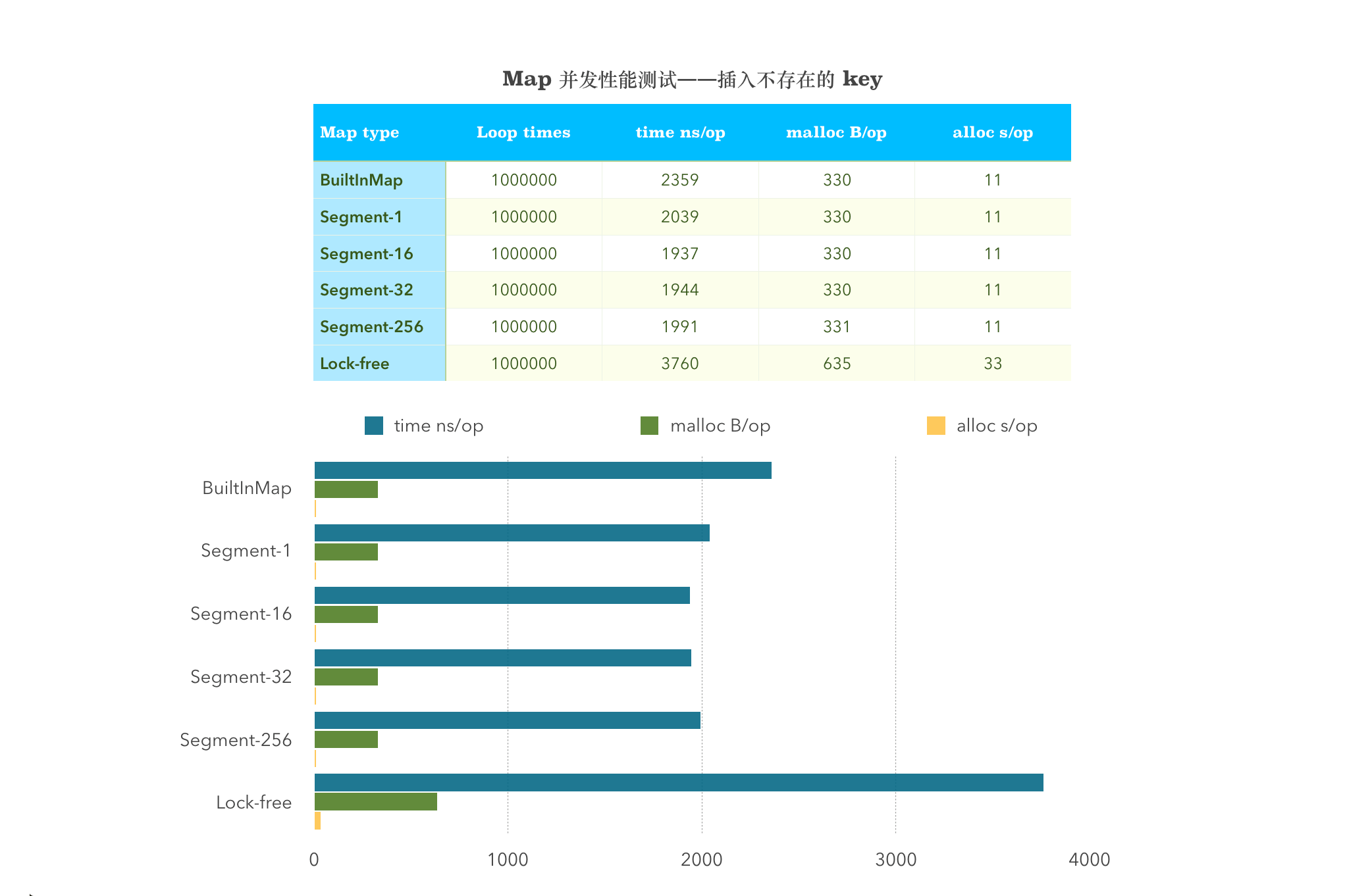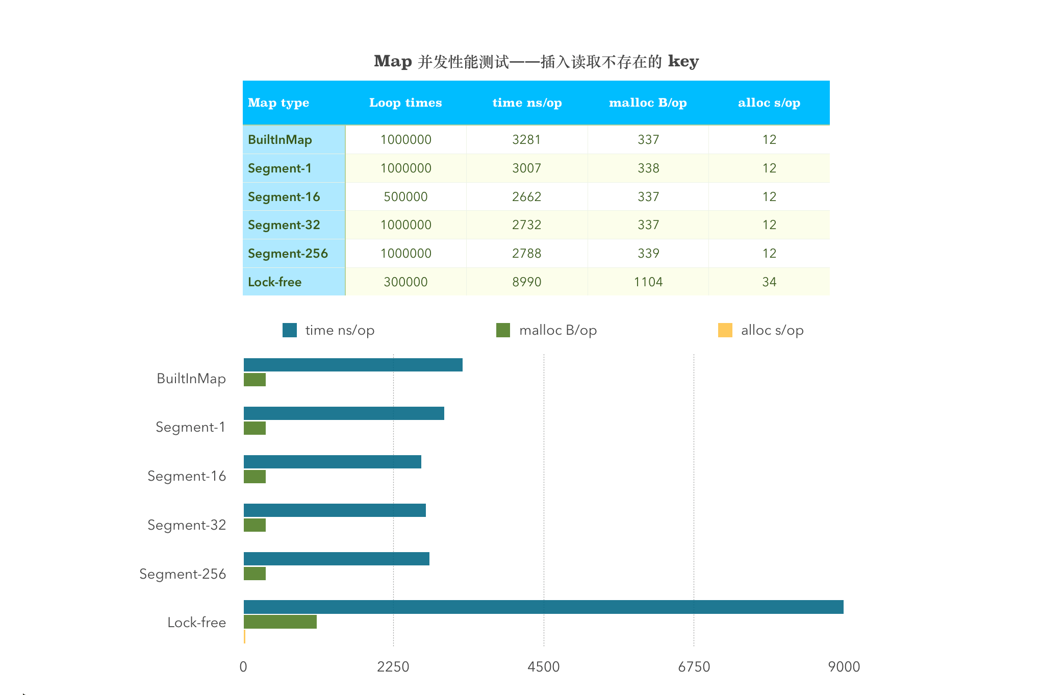 从图中可以看出,sync.map 在涉及到 Store 这一项的均比其他两者的性能差。并发插入读取不存在的 Key,分段锁划分的 Segment 多少与性能没有关系。
