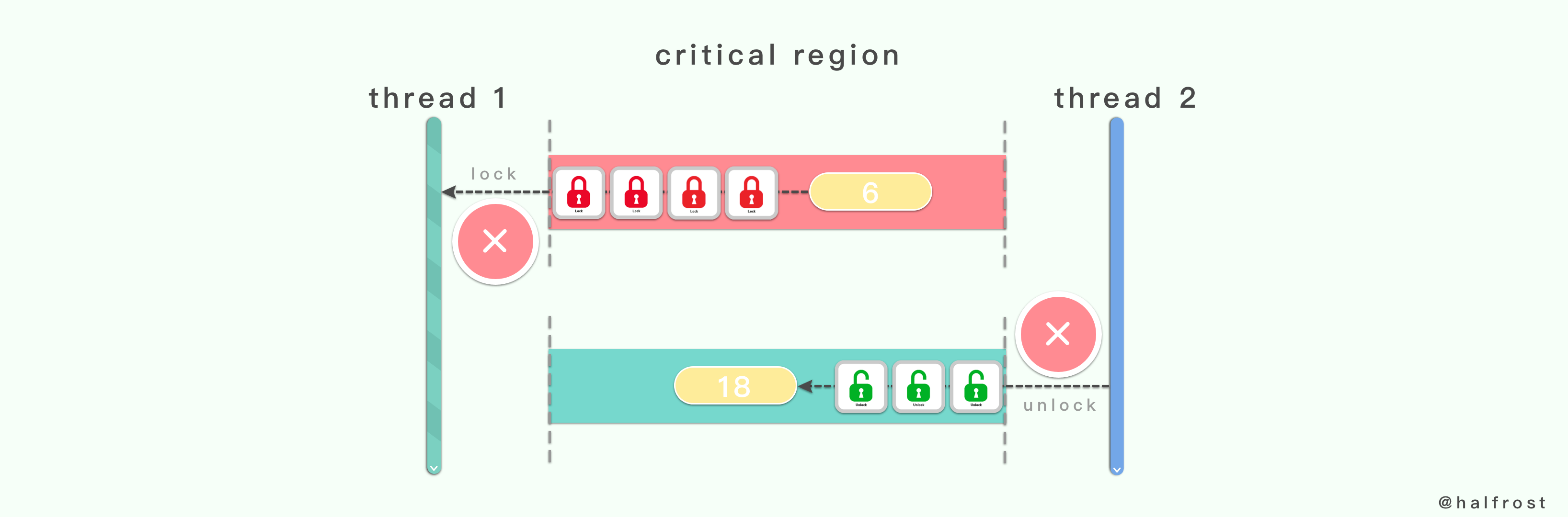 上图就是一个互斥量和一个临界区的例子。当线程1先进入临界区的时候,当前临界区处于未上锁的状态,于是它便先将临界区上锁。线程1获取到临界区里面的值。