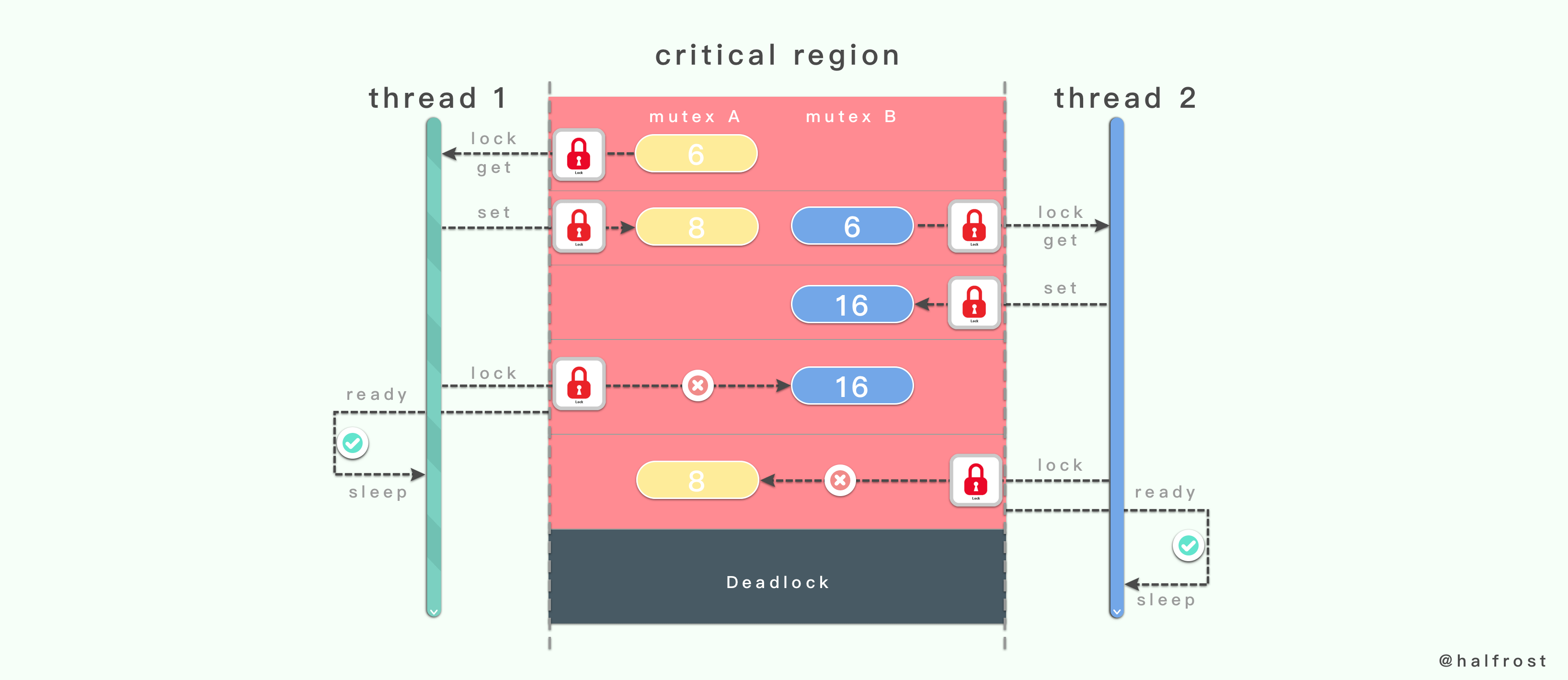线程1先锁定了互斥量 A ,接着线程2锁定了互斥量 B。当线程1在成功锁定互斥量 B 之前永远不会释放互斥量 A。同样,线程2在成功锁定互斥量 A 之前永远不会释放互斥量 B。那么这个时候线程1和线程2都因无法锁定自己需要锁定的互斥量,都由 ready 就绪状态转换为 sleep 睡眠状态。这是就产生了线程死锁了。