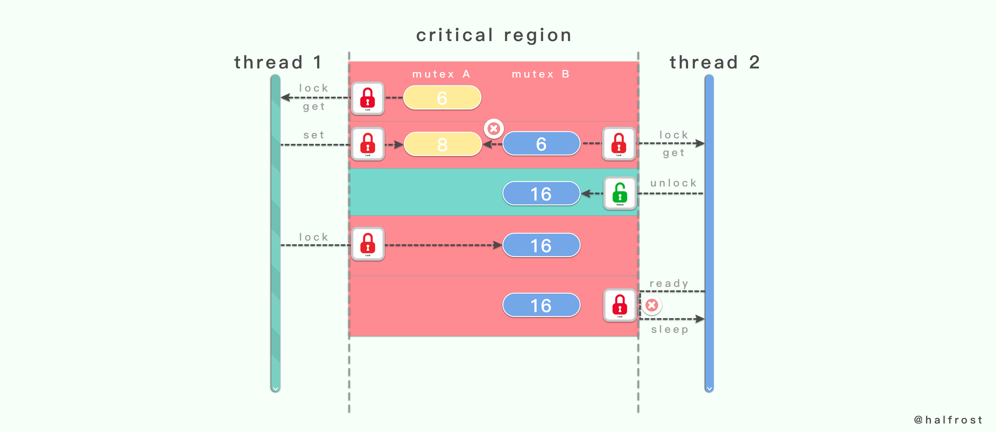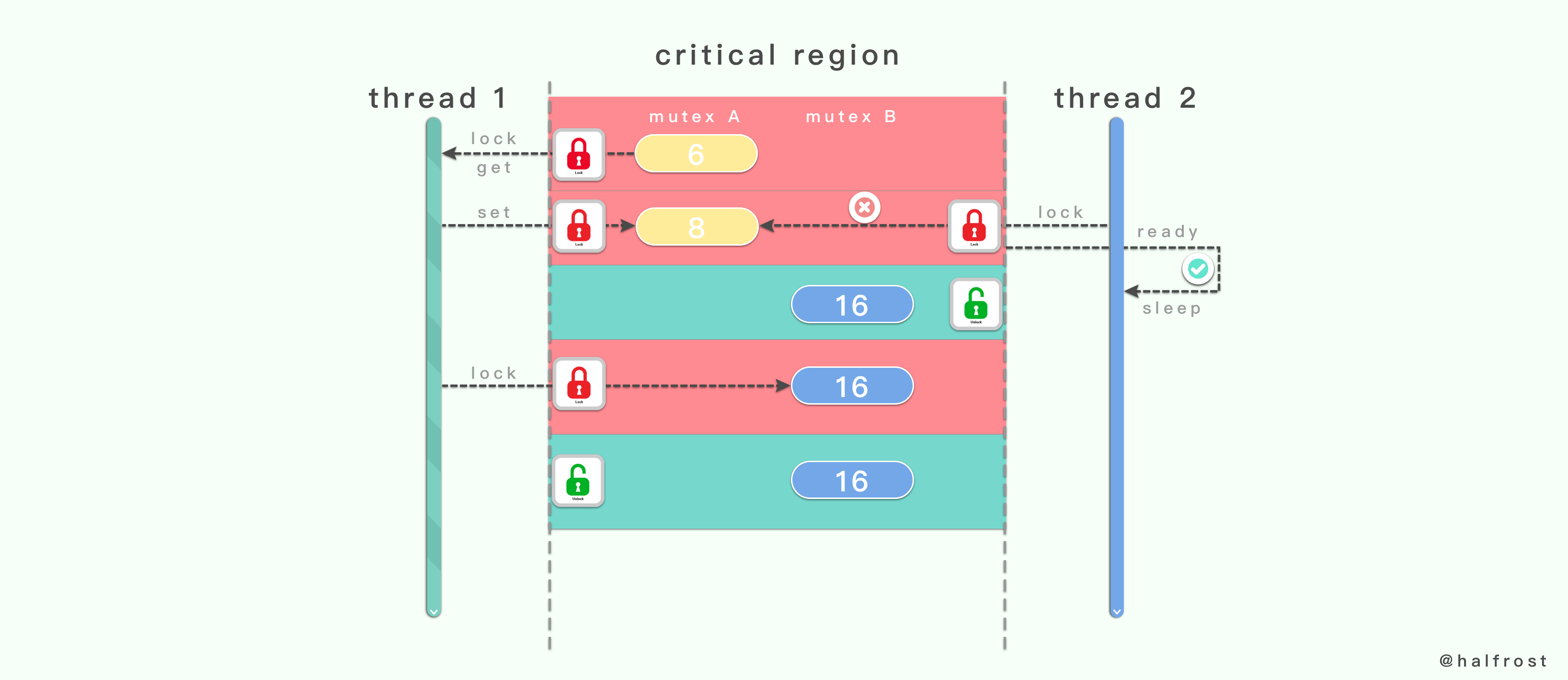 上图这个例子中,一个临界区中存在2个互斥量:互斥量 A 和互斥量