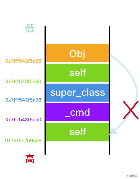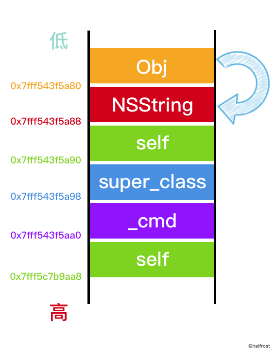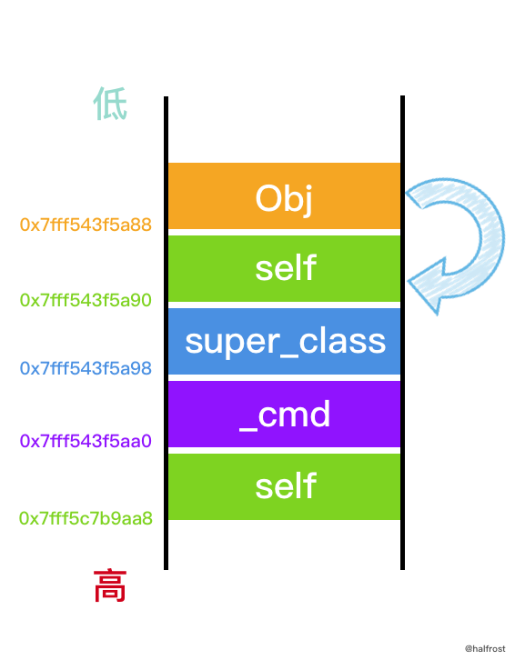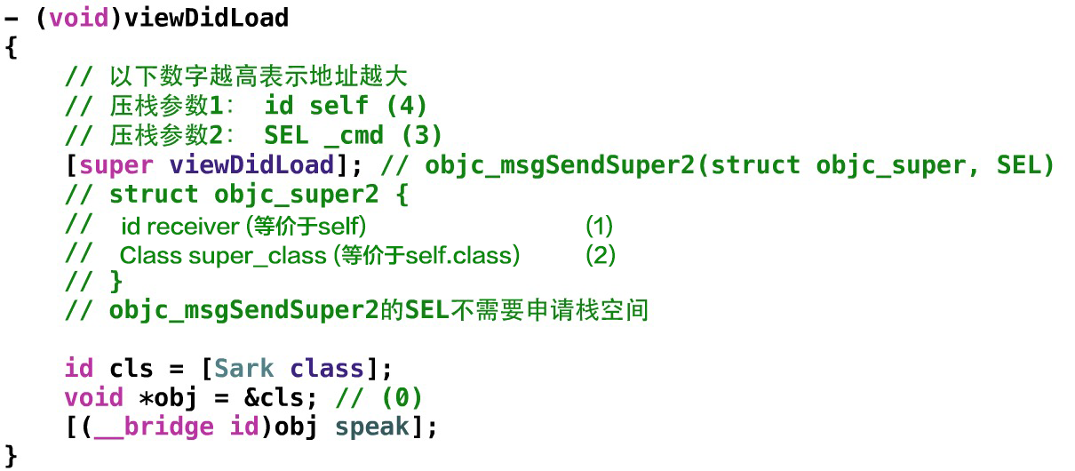 所以按viewDidLoad执行时各个变量入栈顺序从高到底为self, _cmd, super_class(等同于self.class), receiver(等同于self), obj。