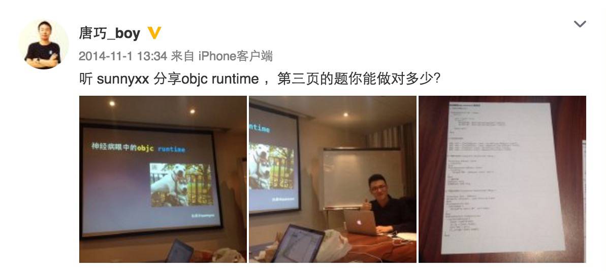 我第一次开始重视Objective-C Runtime是从2014年11月1日,@唐巧老师在微博上发的一条微博开始。