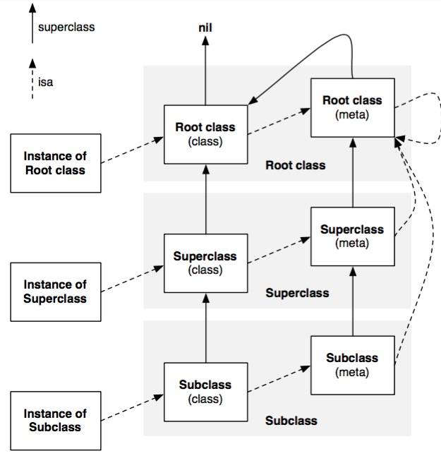 [NSObject class]执行完之后调用isKindOfClass,第一次判断先判断NSObject 和 NSObject的meta class是否相等,之前讲到meta class的时候放了一张很详细的图,从图上我们也可以看出,NSObject的meta class与本身不等。接着第二次循环判断NSObject与meta class的superclass是否相等。还是从那张图上面我们可以看到:Root class(meta) 的superclass 就是 Root class(class),也就是NSObject本身。所以第二次循环相等,于是第一行res1输出应该为YES。