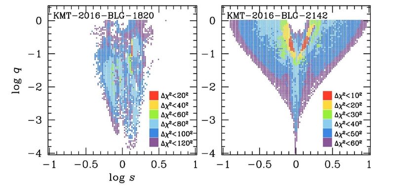 図3. - Δχ^2中に2つの分配(logs、logq)KMT - 2016 - BLG - 1820(左のパネル)とKMT - 2016 - BLG - 2142(右パネル)のためのスペース. 両方のパネルの中で、スペースは(100,100)固定されている格子によって分裂させられます、そして点検されたレンジはそれぞれ -1 < logs < 1と - 4 < logq < 0です。 それに気付いてください - χ