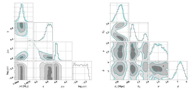 効果的に整列したスピンχeffとログの離心率log10(e)が左側にプロットされています。 外部パラメーターの輝度距離dL、