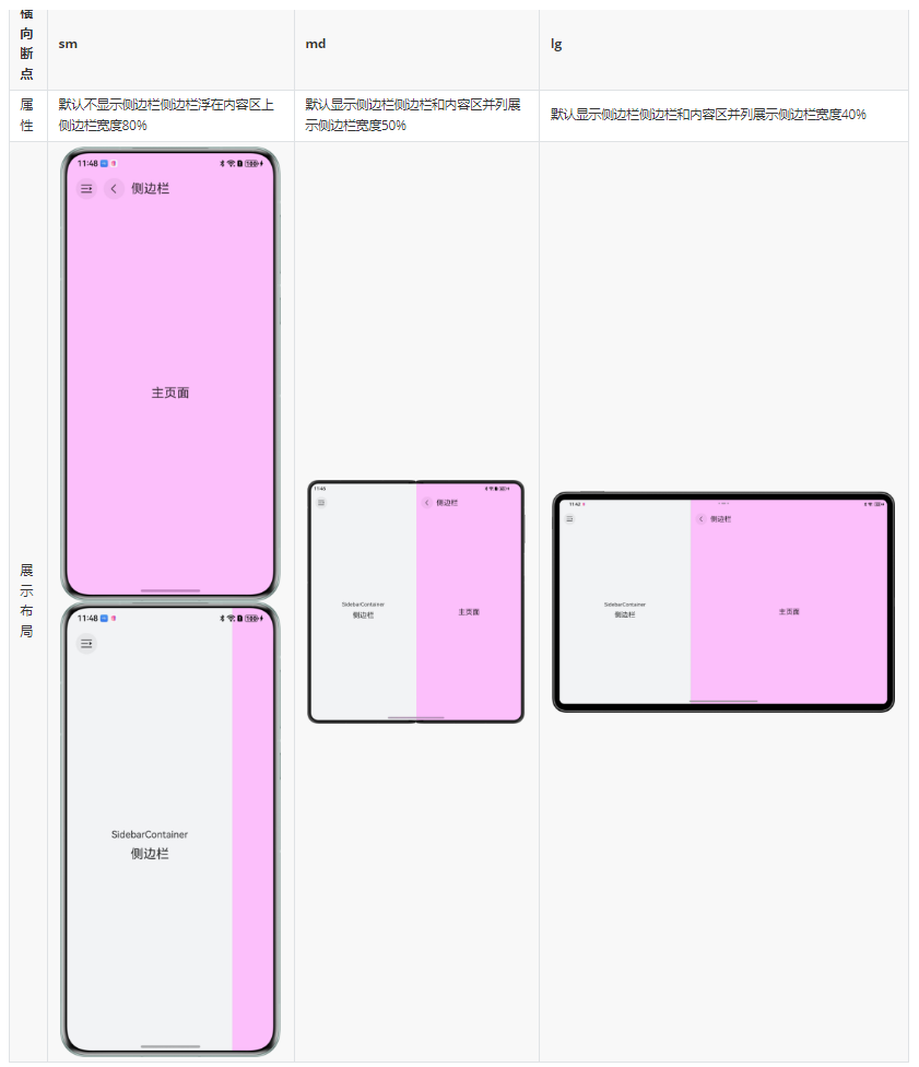| 属性 | 默认不显示侧边栏侧边栏覆盖导航栏侧边栏宽度80%导航栏和内容区单栏显示 | 默认不显示侧边栏侧边栏覆盖导航栏侧边栏宽度50%导航栏和内容区分栏显示导航栏宽度50% | 默认显示侧边栏侧边栏嵌入导航栏侧边栏宽度20%导航栏和内容区分栏显示导航栏宽度30% |