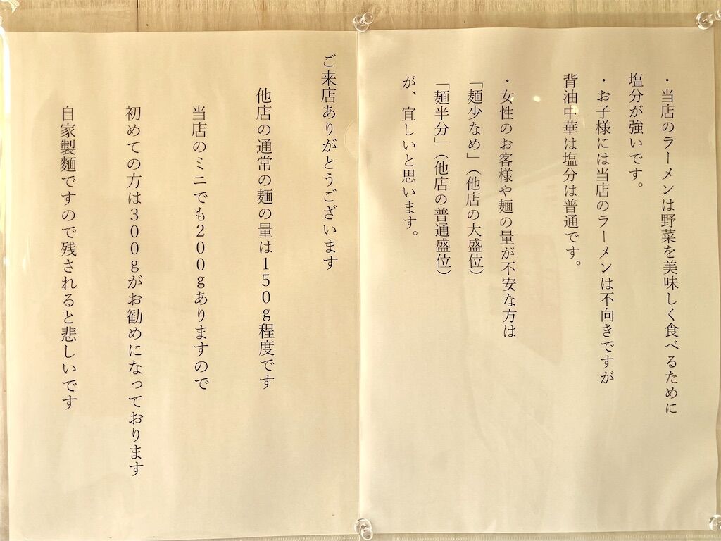 左端に「自家製麺ですので残されると悲しいです」の記載.
