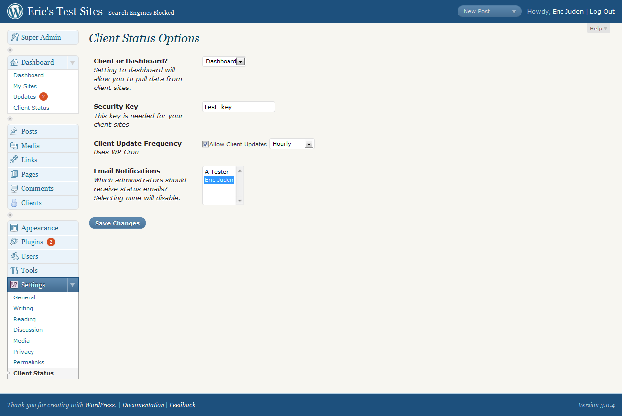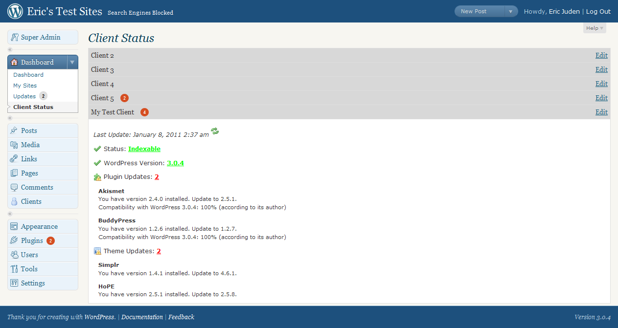 Client Status is a dashboard that keeps tabs on your clients WordPress installations by checking for the latest updates to the WordPress core, plugins and themes. You have the option to enable emails to administrators of your site and the clients the site belongs to. Client Status can check for updates hourly, twice daily, or daily (uses the WordPress Cron system). This is meant to be a free alternative to the WordPress Status Dashboard found on codecanyon.net.