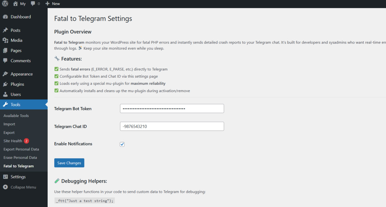 - βοΈ Configurable via WordPress admin (Tools > Fatal message to Telegram)