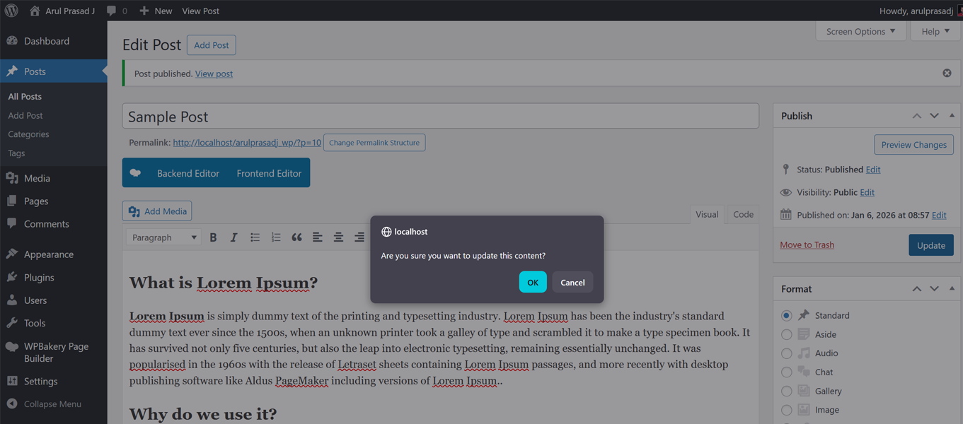 When working with page builders such as Elementor, WPBakery, confirmations are displayed when publishing or updating content via the WordPress editor controls rather than the builder’s own interface.