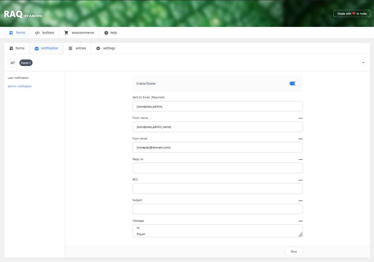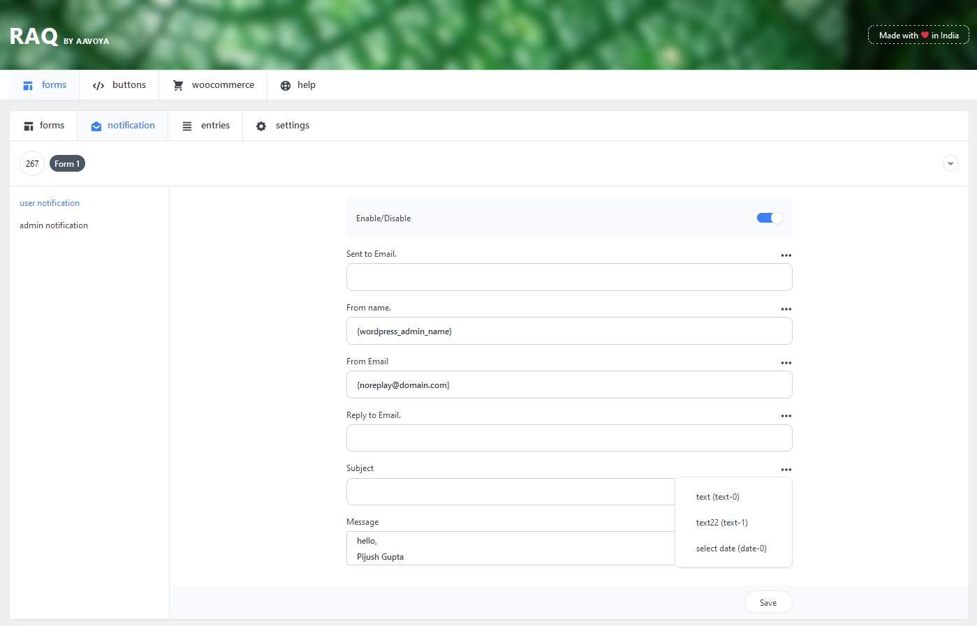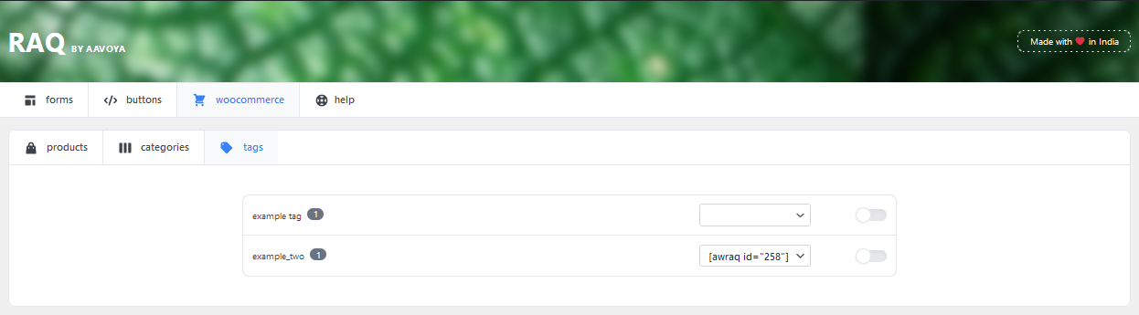 Assuming that you have installed and activated woocommerce and created a product. Also assuming that you have created a form and a button. Go to “RAQ Pro” page > go to woocommerce tab and click on tags sub tab. Now go to tags row and select a button from drop-down and turn on the toggle switch.