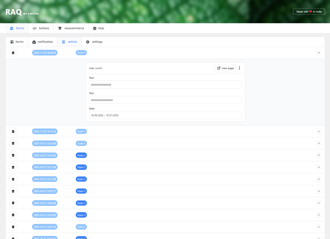 Request a Quote Pro by Aavoya called ‘RAQ Pro’ in the menu. In that page will find modules for forms and buttons. Each module have settings which are applicable them.