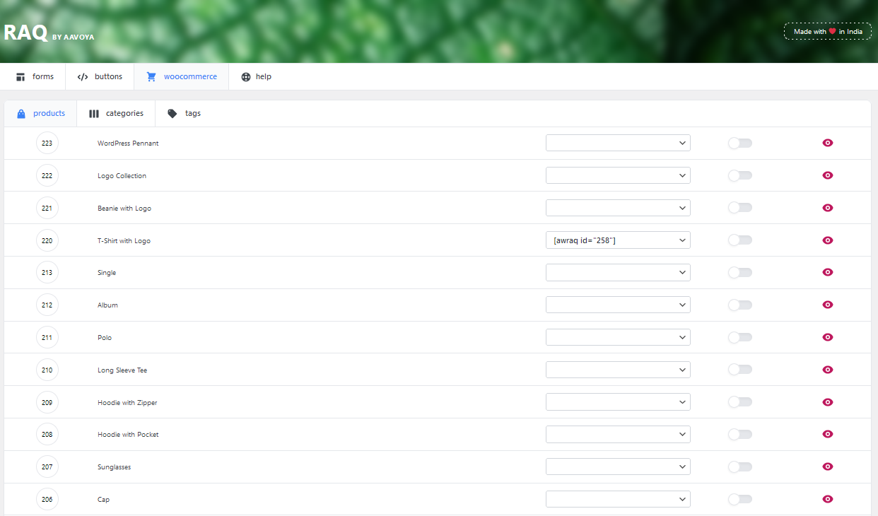 Assuming that you have installed and activated woocommerce and created a product. Also assuming that you have created a form and a button. Go to “RAQ Pro” page > go to woocommerce tab and click on product sub tab. Now go to product row and select a button from drop-down and turn on the toggle switch. To see product with enabled RAQ, click on eye icon on the right of the product row.