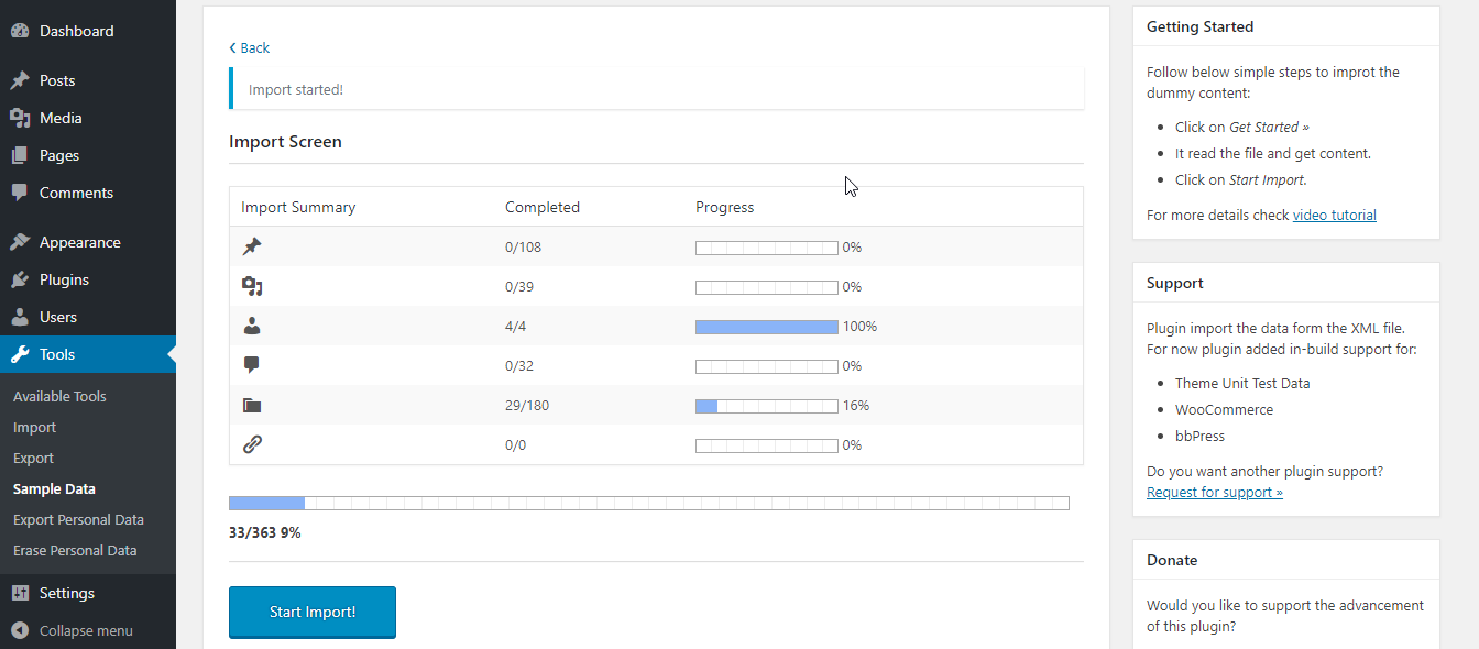 1. Install the Sample Data plugin either via the WordPress plugin directory, or by uploading the files to your server at wp-content/plugins.