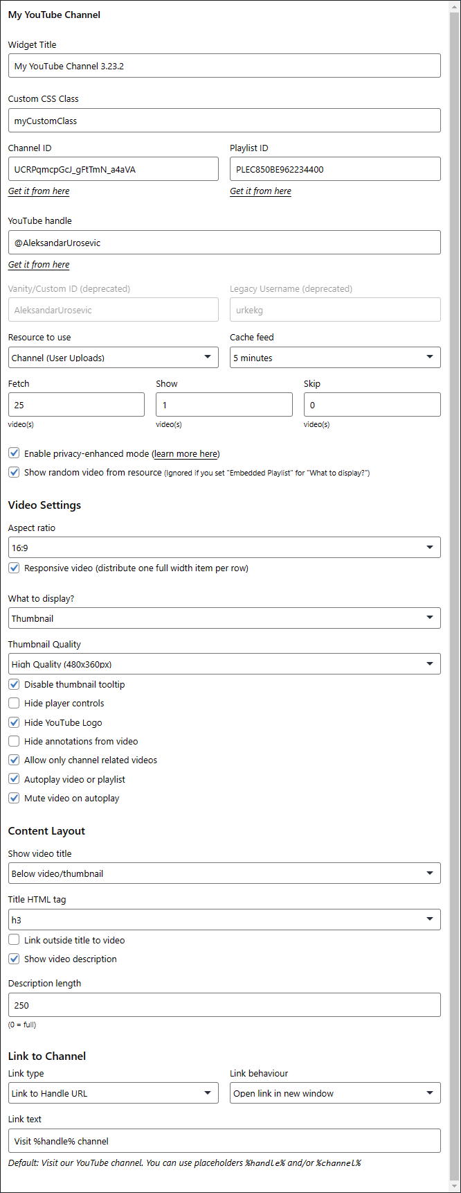 class(string) Set custom class if you wish to target special styling for specific YTC blockchannel(string) ID of preferred YouTube channel. Do not set full URL to channel, but just last part from URL – ID (name)handle(string) defined custom handle from YouTube handlevanity(string) DEPRECATED part after www.youtube.com/c/ from Custom URLusername(string) DEPRECATED Optional legacy YouTube username.playlist(string) ID of preferred YouTube playlist.resource(int) Resource to use for feed:0Channel (User uploads)1DEPRECATED Favorites (for defined channel)2Playlist3DEPRECATED Liked Videos