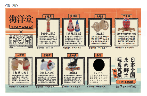 第2弾でモチーフになったのは宮城、新潟、長野、三重、大阪、京都、高知の郷土玩具。ラインアップは以下の通りです。