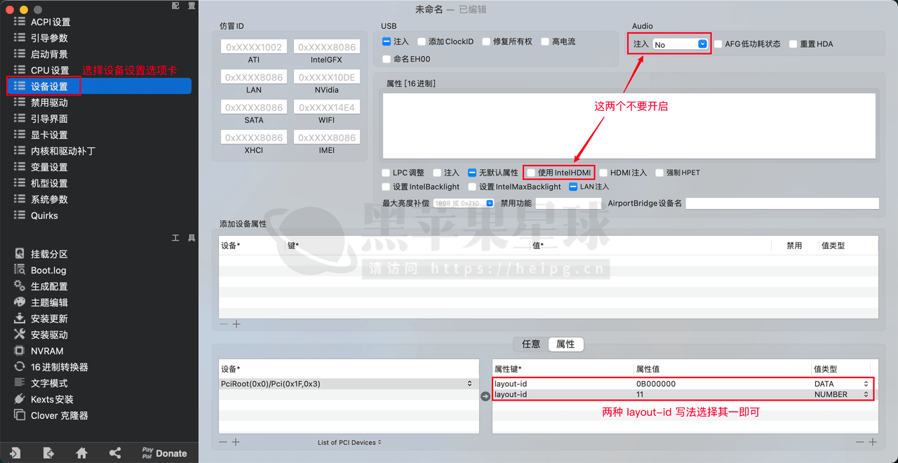 经过上一步确定了要使用的 id 以后,就可以把信息固定到设备属性(DeviceProperties)中,这里分为 OpenCore 和 Clover 两种情况。