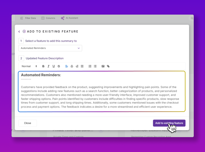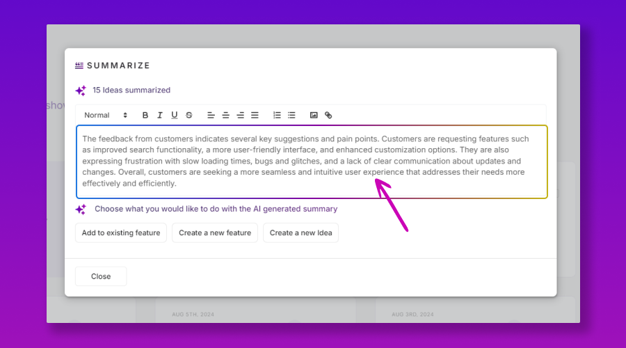 Once you’ve reviewed the summaries, you can quickly move on to creating a new feature or brainstorming new ideas based on the insights the AI provides.