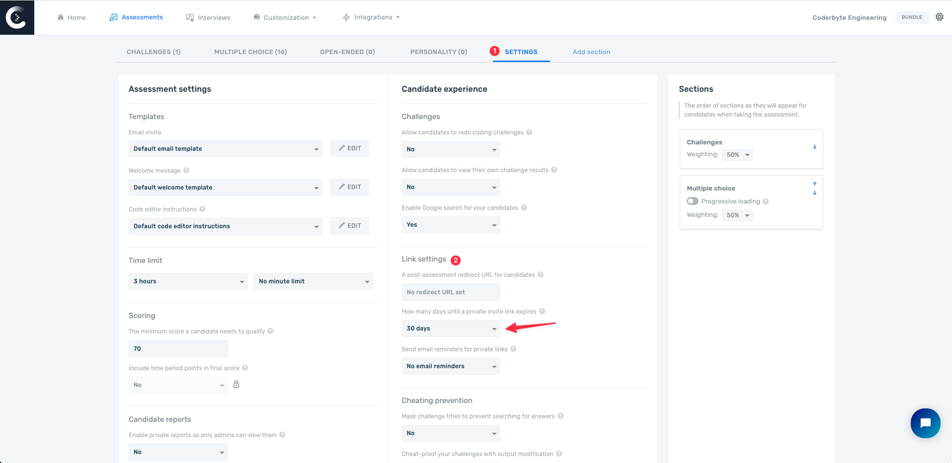 If you invite candidates via a private link, you can make the link expire after a certain number of days. Edit any Assessment and navigate to (1) Settings. Then, (2) select the number of days until the private invitation link expires.