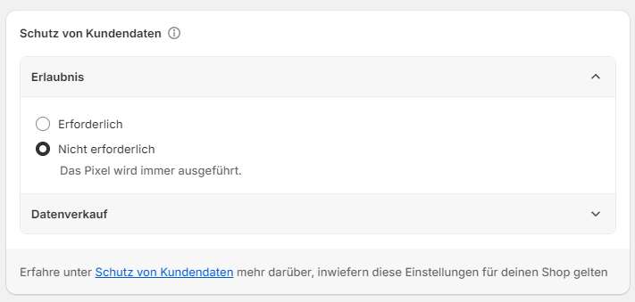 Das integrierte Consent Management von Shopify ist sehr eingeschränkt und kann nicht zwischen unterschiedlichen Zwecken unterscheiden. Daher darf dieses nicht aktiviert werden! Stattdessen empfehlen wir die Nutzung des in etracker analytics integrierten Tag und Consent Managements.