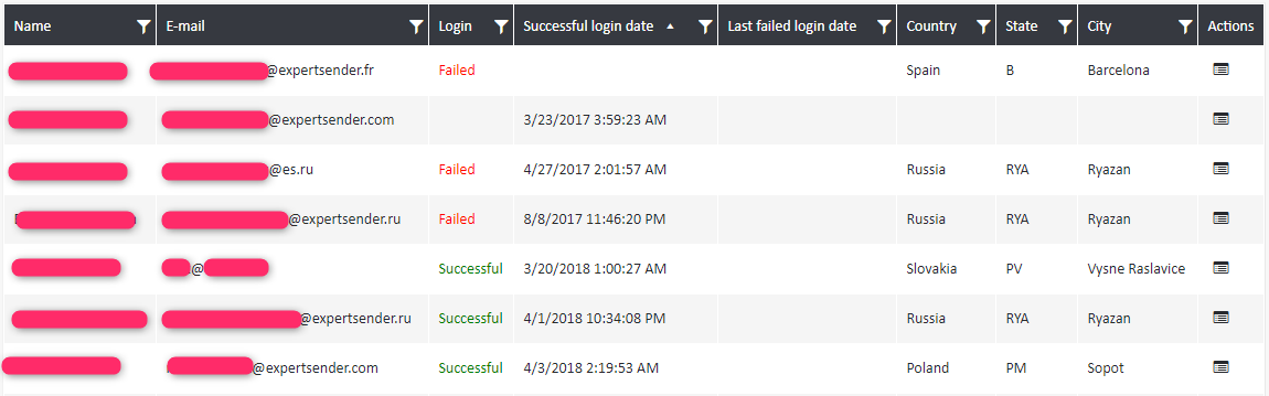 Actions: you can view a more detailed log for the given login attempt which contains information on the IP number