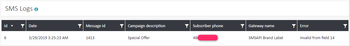 The log contains information on the SMS and MMS messages which were sent within the current business unit.