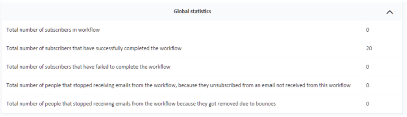 The graphical representation of your workflow below displays how many subscribers have gone through each step of the workflow, how many are at a particular stage and how many have opened a given workflow message, clicked inside it or were converted.