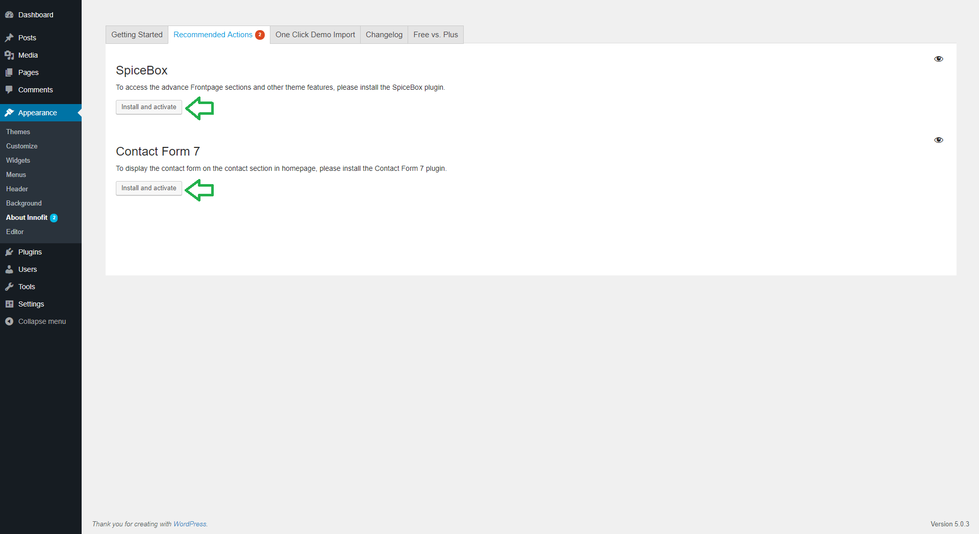 Just after the installation and activation of Innofit theme, navigate to the Innofit About page ( In your WP Admin Panel, go to → Appearance → About Innofit ). Here you will see all the necessary links and information about the theme and we have also recommended plugins to install as follows: