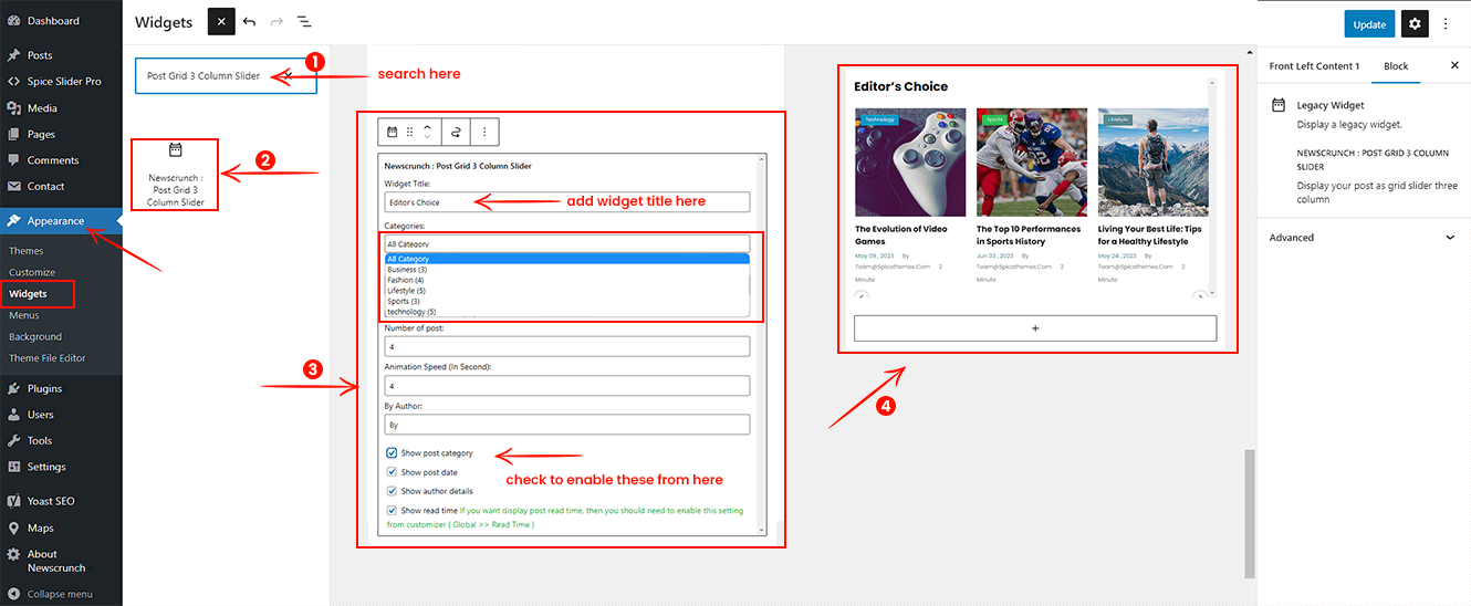 - Search for “Vertical Post Slider Sidebar” in the search area