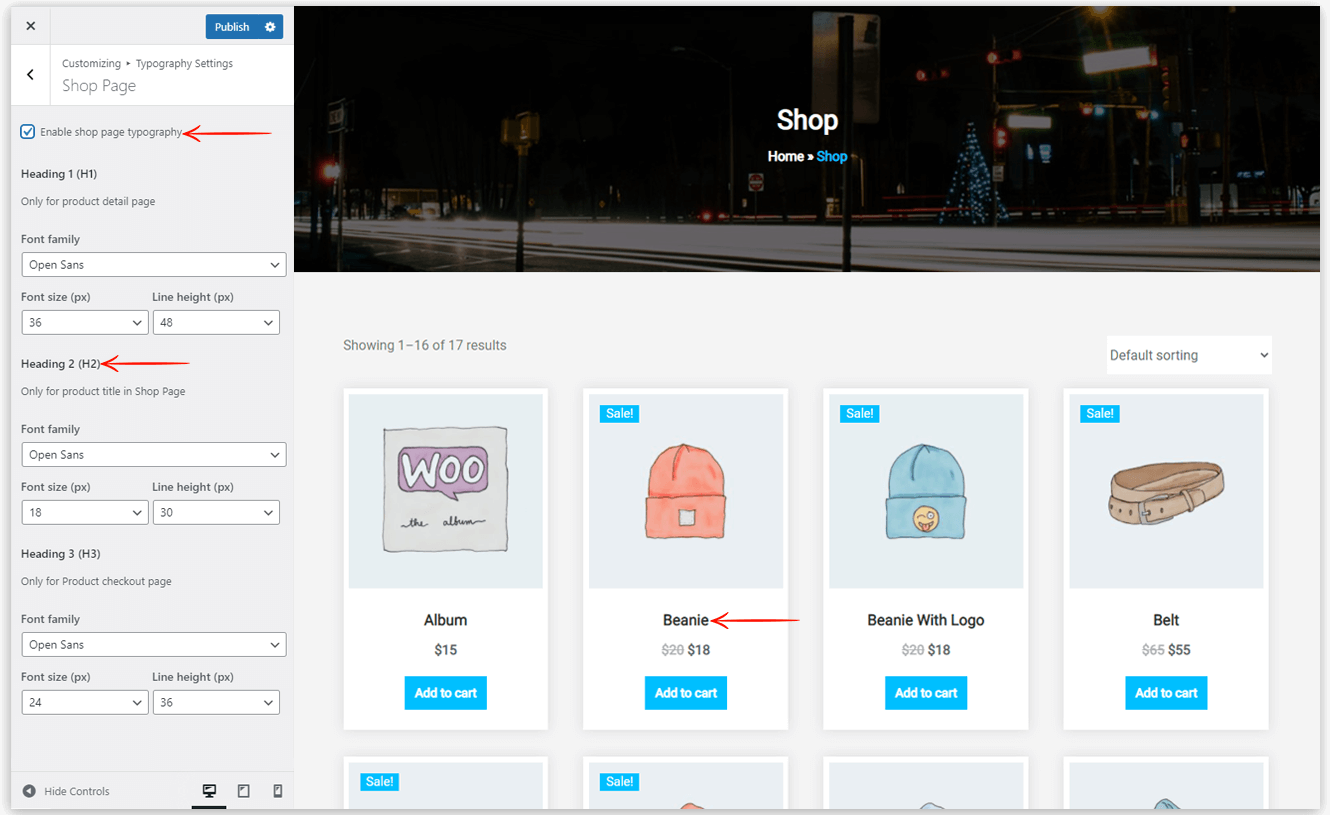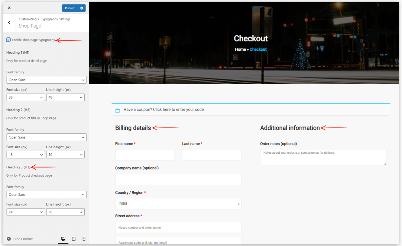 This option helps you to set the typography for the shop page contents like product title in the shop page and product detail page. Also, you can change the typography of checkout and cart page headings from here.