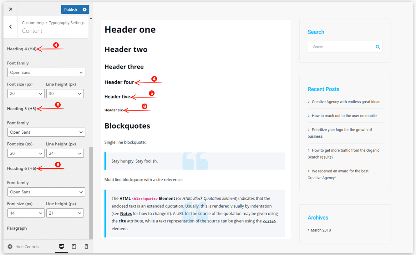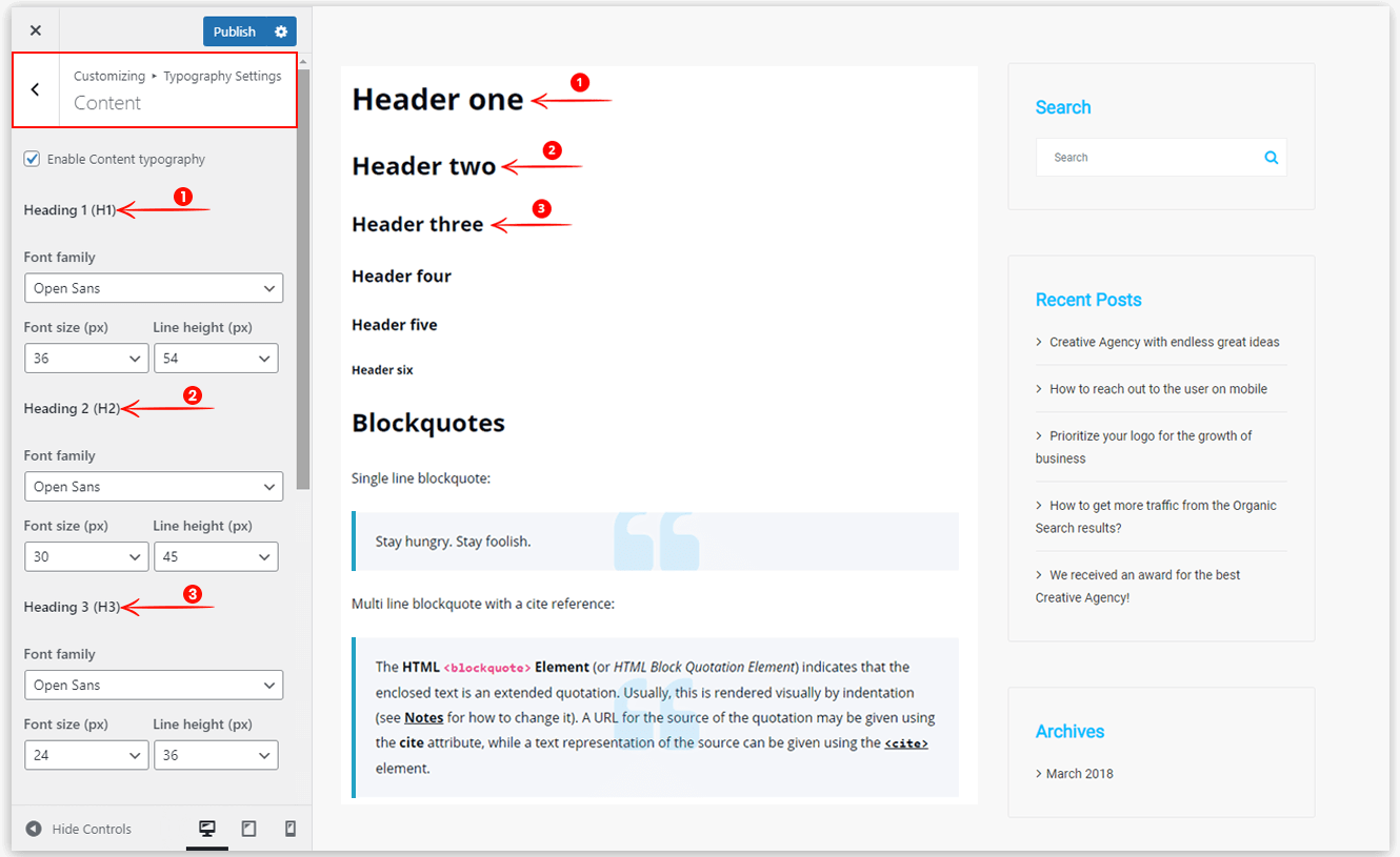 This option helps you to set the typography for the headings H1 to H6, paragraph, and button text. You can set the typography for the custom content coming from the page or post editor from here.
