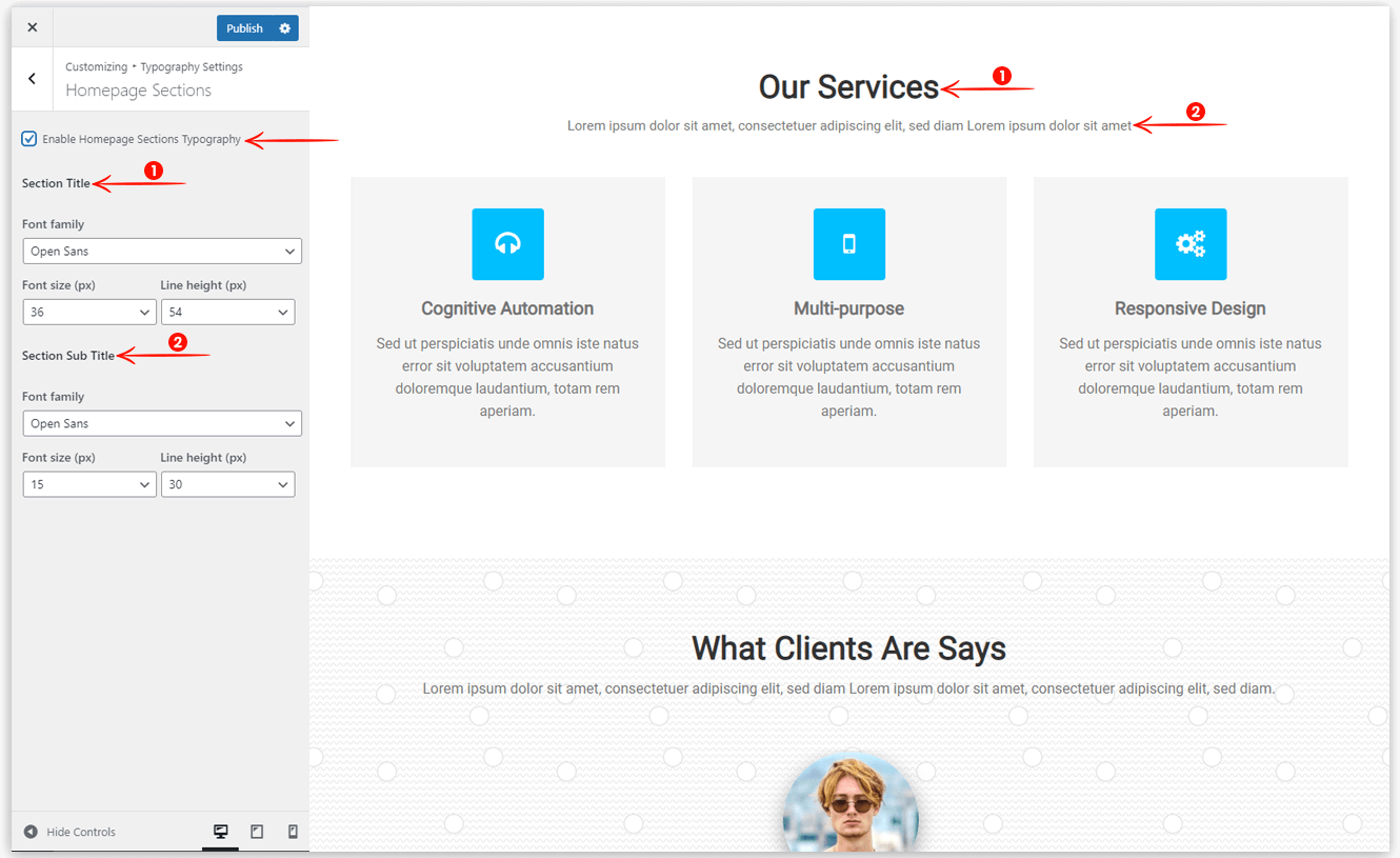 This option helps you to set the typography for the homepage section’s title and description.