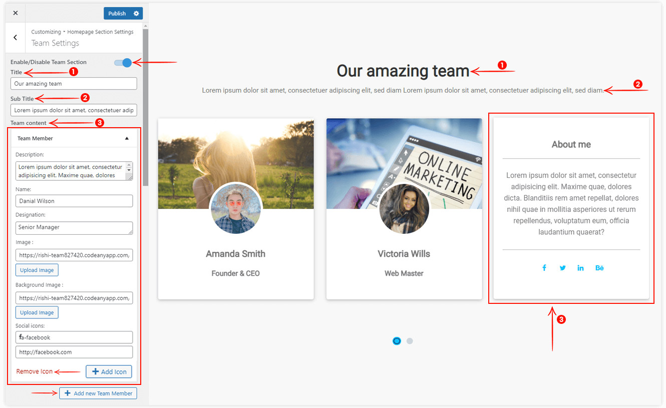 - Enable/Disable Team Section: Hide/Show Team section on the Homepage.