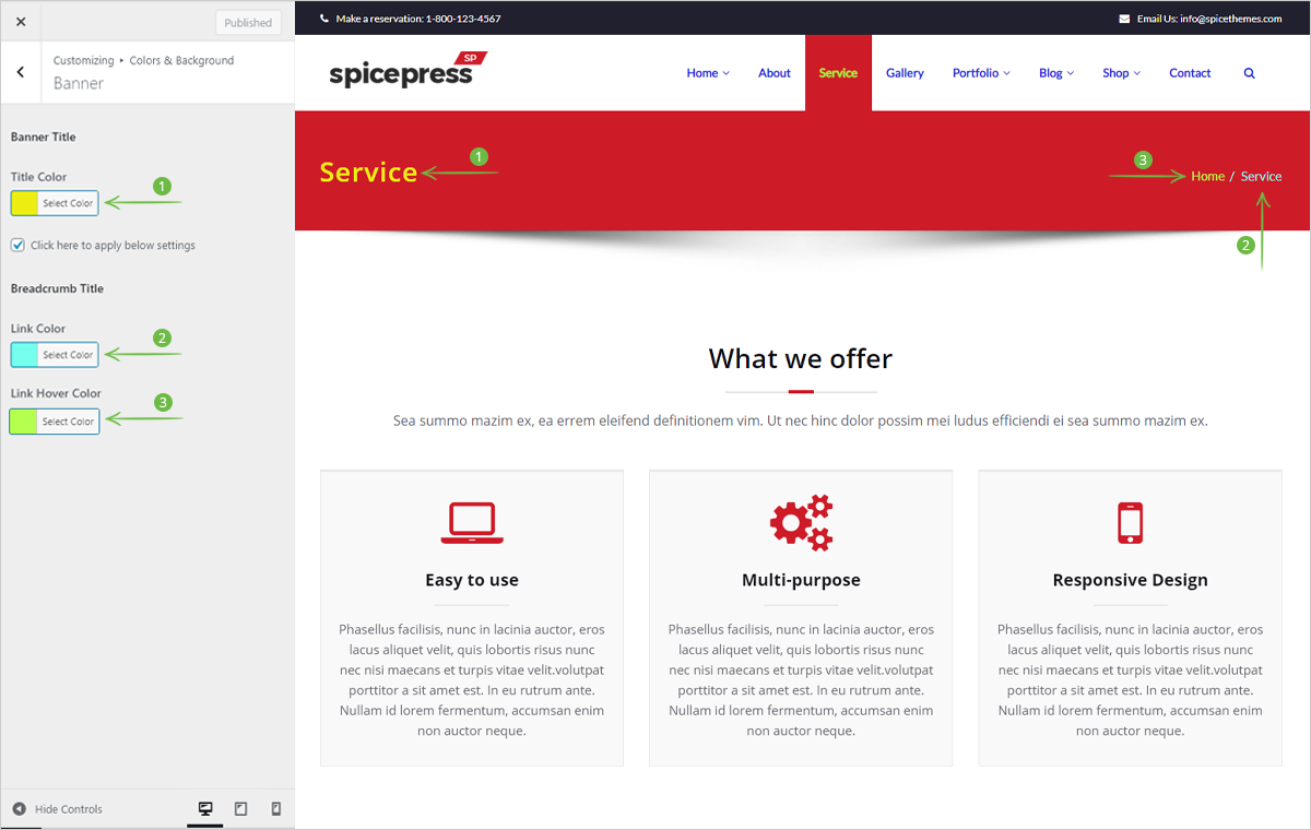 This option helps you to set the color of the banner title and breadcrumb title. You need to enable the checkbox “Click here to apply below settings” to apply the color for the breadcrumb title.
