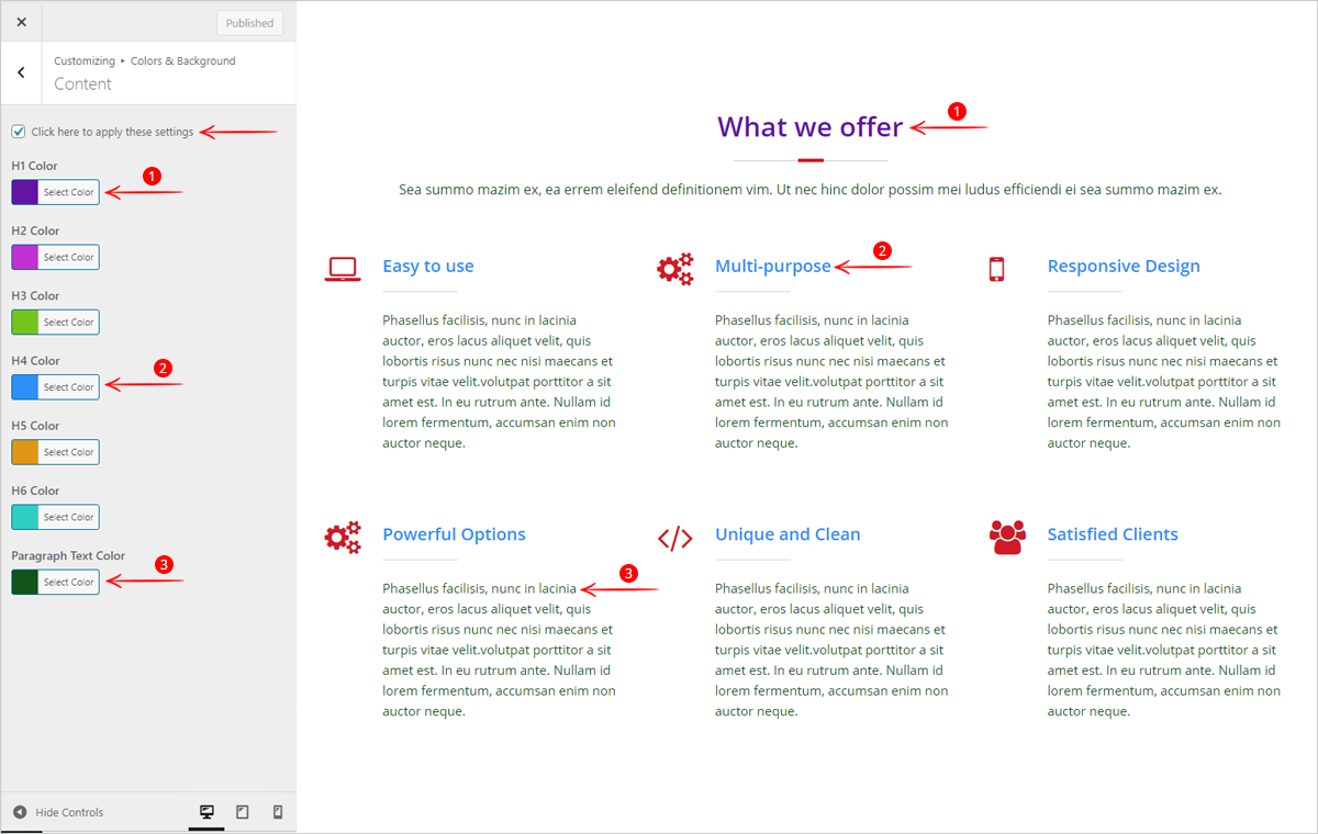 This option helps you to set the color of H1 to H6 and paragraph. This setting basically for the custom content that means the content which is coming from the editor in the whole site.