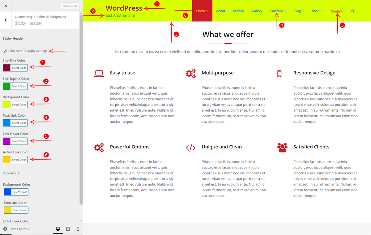 This option helps you to set the background color of the sticky header and you can change the color for Site Title and Tagline on the sticky header. If you want to apply colors on the site title and tagline then you need to enable the display option in customizer. Go to Appearance >> Customize >> Site Identity and enable the option “Display Site Title and Tagline“. You need to enable the checkbox “Click here to Apply Settings” to use these settings. You are also able to change the colors of the menu and submenus for the sticky header.
