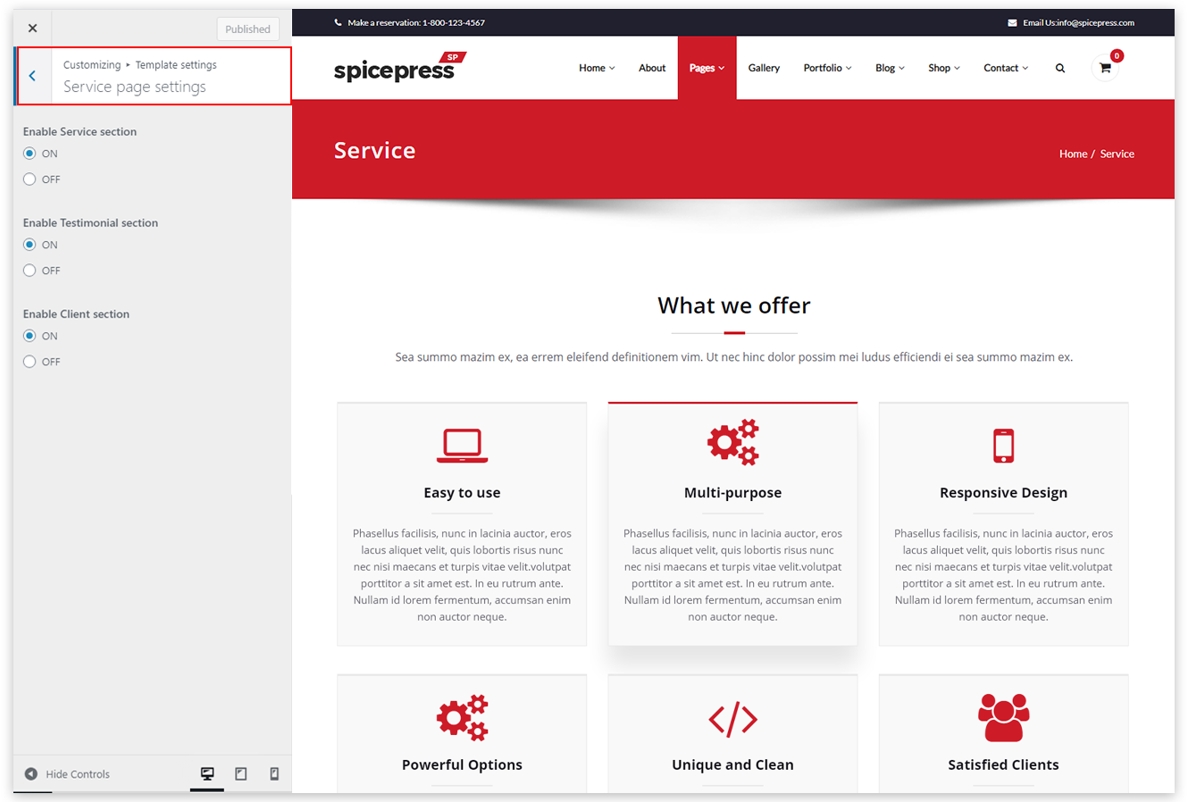 Here you can add your own content from the page editor and also add some defined sections from the homepage like the testimonial section. There are 3 sections of the homepage here: Service section, Testimonial section, and Client section. You can enable and disable these sections for the service page from here.