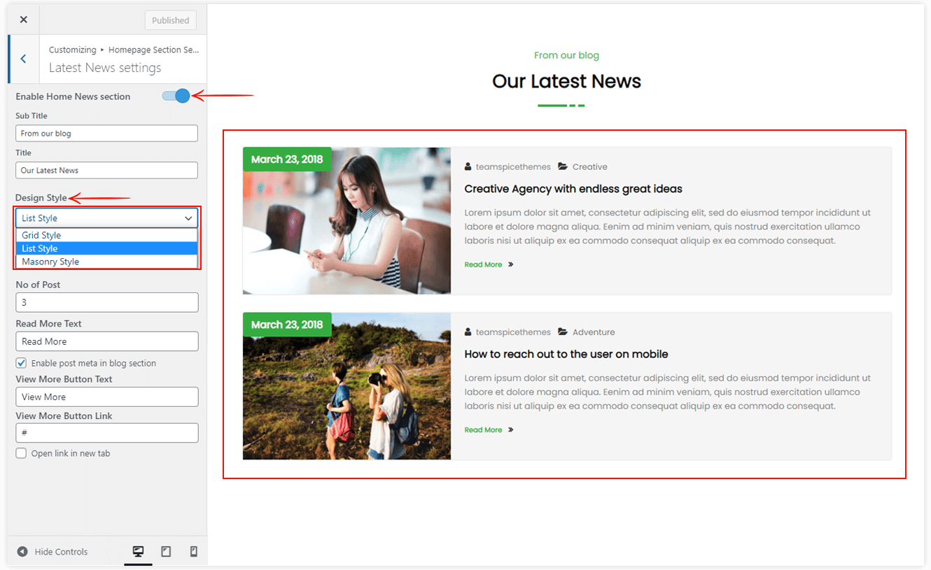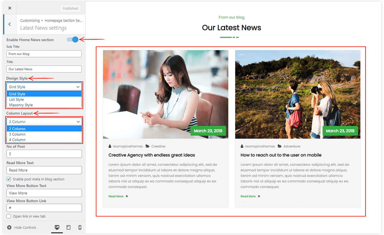 There are various design styles in the latest news section. You can choose anyone which suits best on your site. Also, you can select the columns and number of posts to show in the news section.