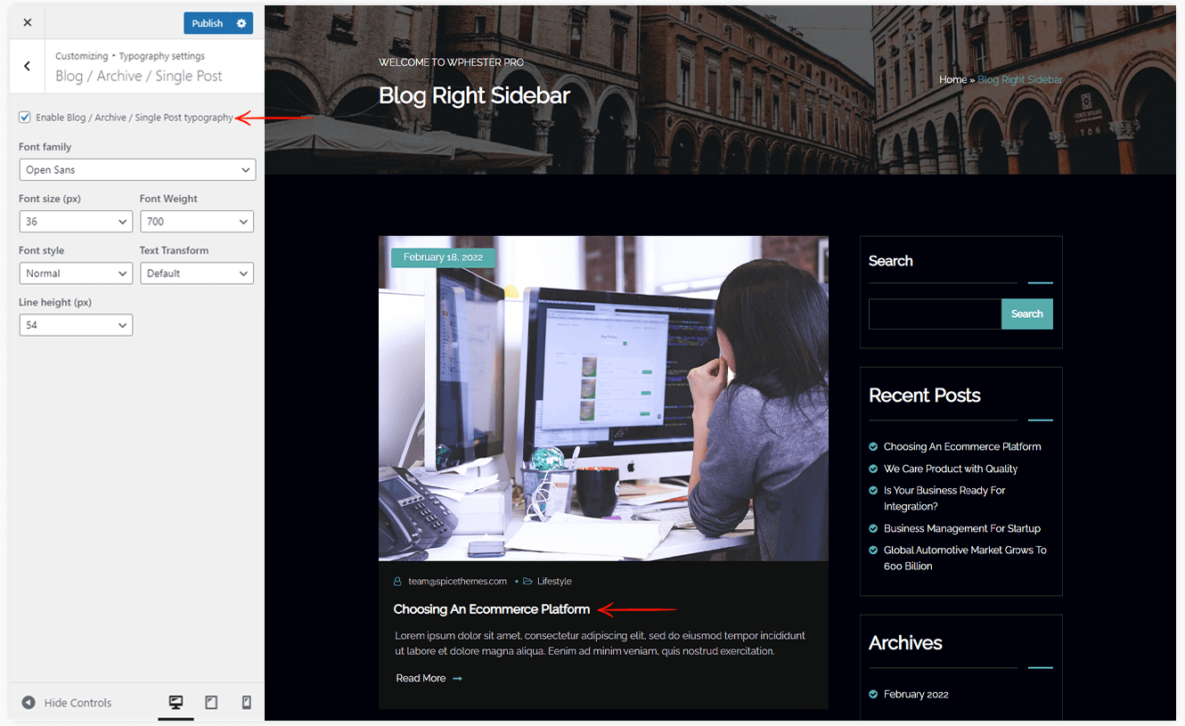 This option helps you to set the typography for the post title display on the blog page, archives, and single post.