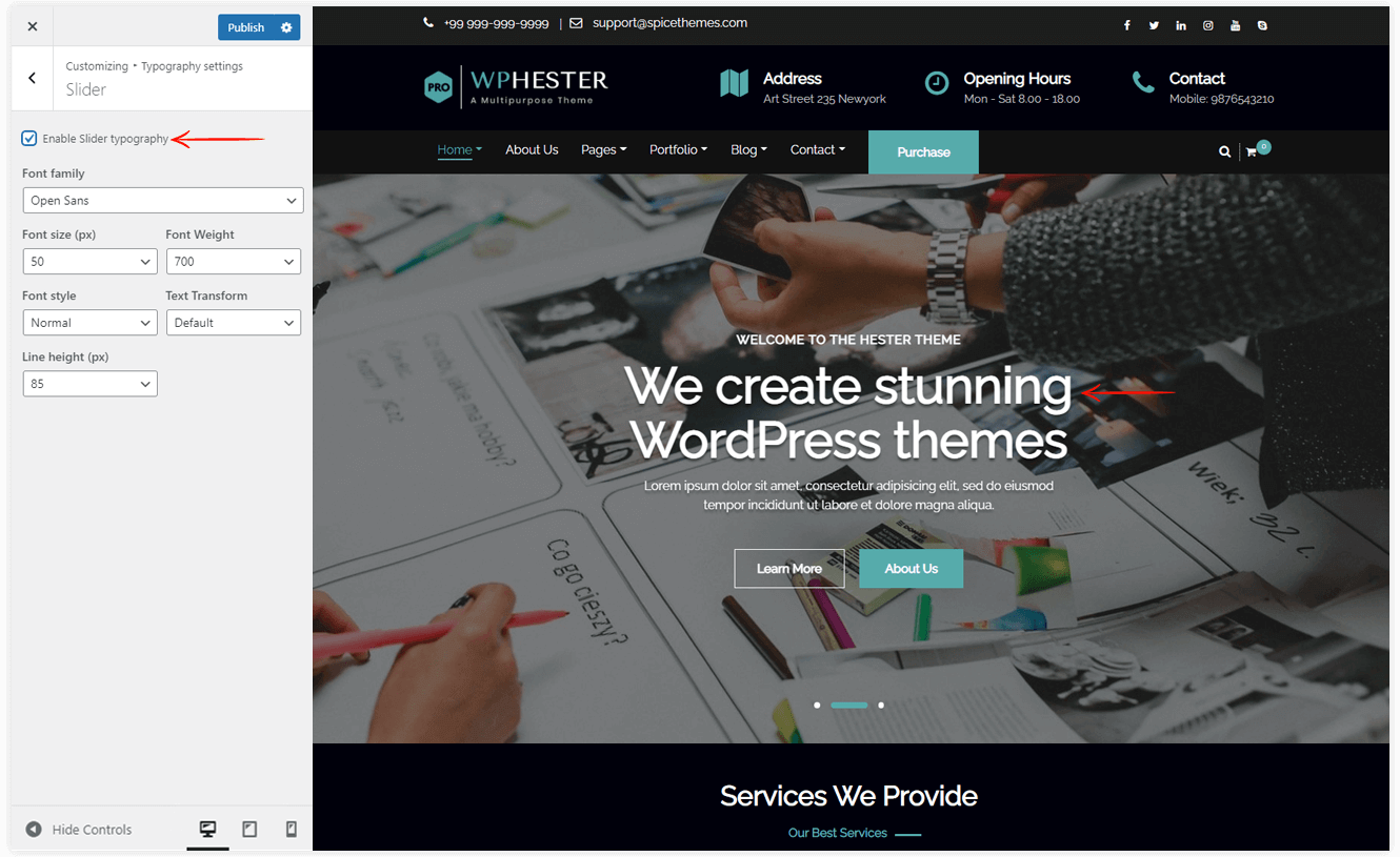WPHester Plus Typography gives you complete control to manage typography from header to footer on your website. This will help you to manage fonts throughout your website. You can easily manage the font style, font size, font weight, font family, text-transform, and line height.