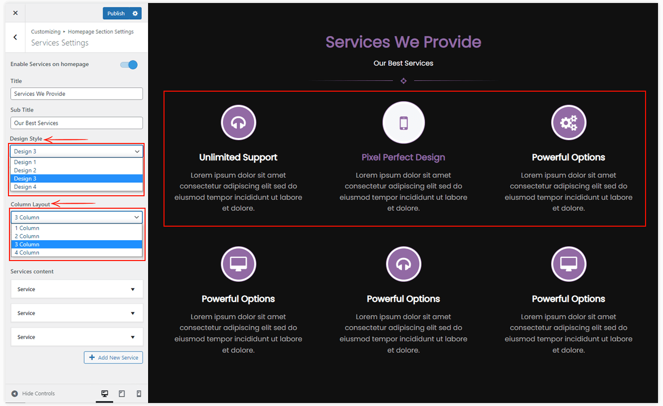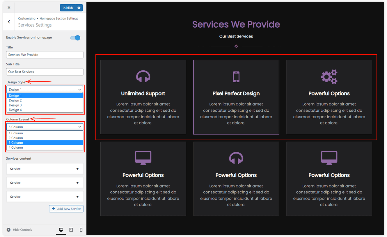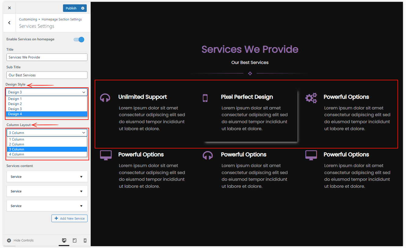 - Enable/Disable Service Section: Hide/Show Services section on the Homepage.