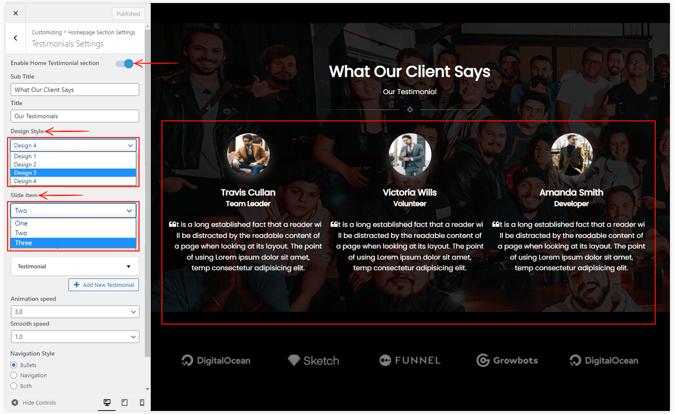 - Animation Speed: Set the animation speed of the testimonial section.