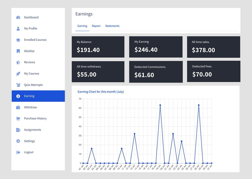 You can also benefit from earning and commissions allocation options inside this popular LMS software. Whether it is about distributing or setting commissions, Tutor LMS can help you manage it all.