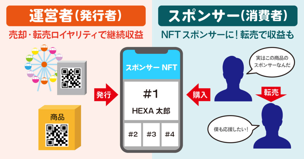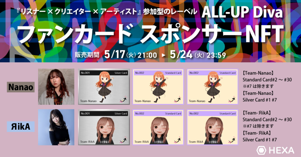 ALL-UP Diva(オールアップディーバ)のアーティストNanao、ЯikAが自身のキャラクターを使ったデザインのファンカードをスポンサーNFTとしてHEXA(ヘキサ)で販売します。カードはすべてナンバリングされており、1点物となっています。カードデザインのスポンサーNFTを保有することで、アーティストNanao、ЯikA、かんきのスポンサーであることを公言でき、またNFTページ上からその証明をすることができます。Nanao、ЯikA、かんきがより人気になると、より多くの個人や企業がスポンサー枠を購入する需要が生まれるため、スポンサーNFTが値上がりする可能性も生まれます。