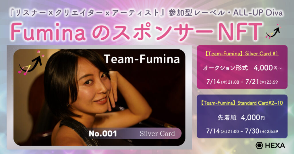 HEXA(ヘキサ)でALL-UP Diva( @ALLUP_Diva )様のアーティストNanao( @Nanao_po )様、ЯikA( @rikachannelll )様、かんき( @kanki_godlucky )様、Fumina( @Fumina62186236 )様がスポンサーNFTを発行されています。ALL-UP Diva様のスポンサーNFTについてインタビューさせていただきました。