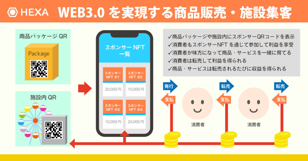 HEXA(ヘキサ)ではWEB3.0のファンが所有者になってサービスの成長を実現するという仕組みを、リアルの商品ブランドに応用した「スポンサーNFT」のプロジェクトを始動しました。「スポンサーNFT」プロジェクトでは、商品ブランドや施設のスポンサーになって応援したいお客様がNFTを購入し、その商品ブランドや施設のスポンサーになる事ができます。