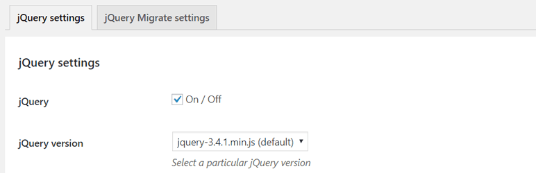 When the plugin is activated the latest stable version of jQuery and jQuery Migrate are added to your website. The default is sufficient for most people, however the settings provide a way for you to tweak your jQuery install.