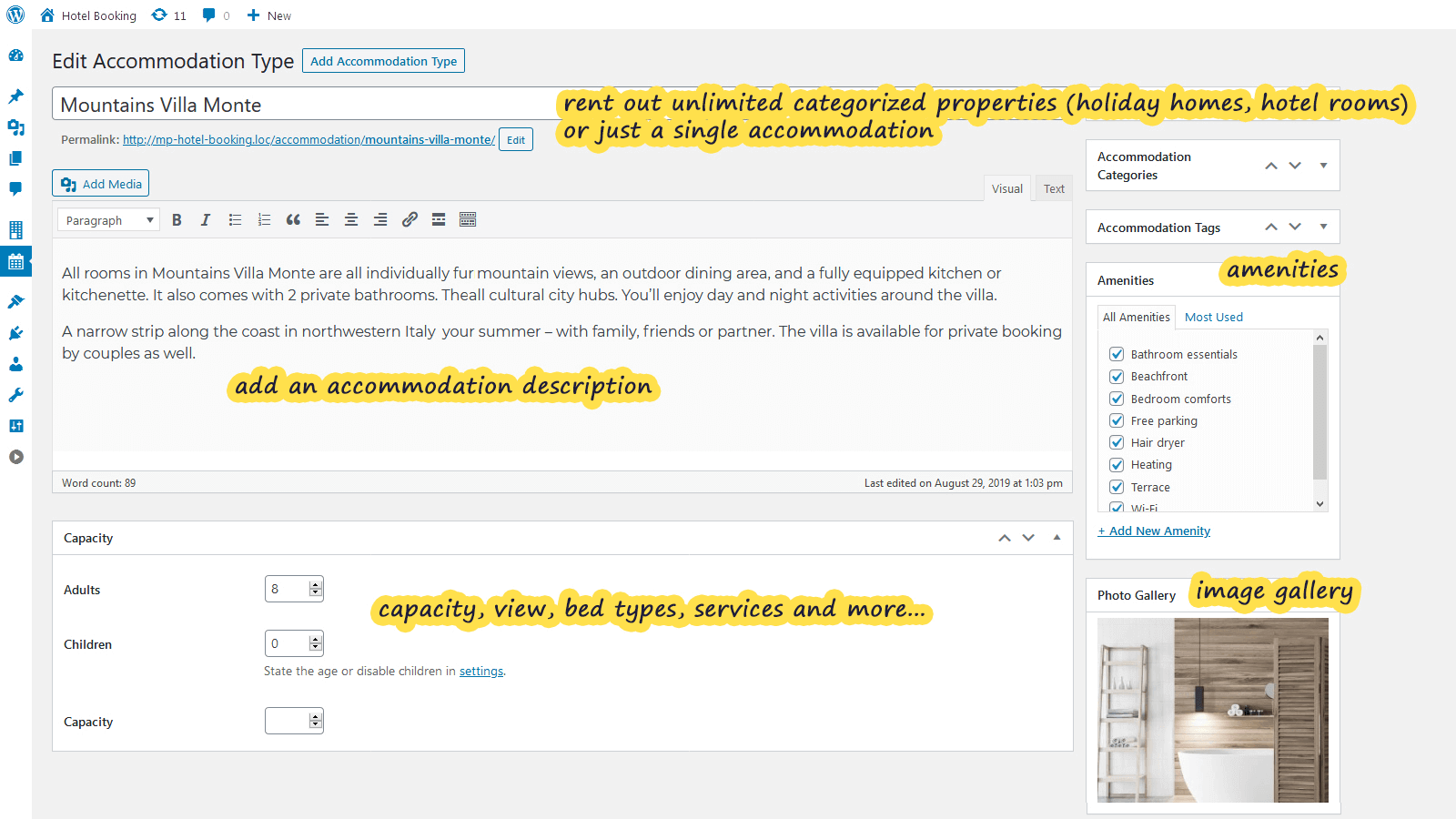 Add an accommodation description, image gallery, capacity, view, bed types, services and more.