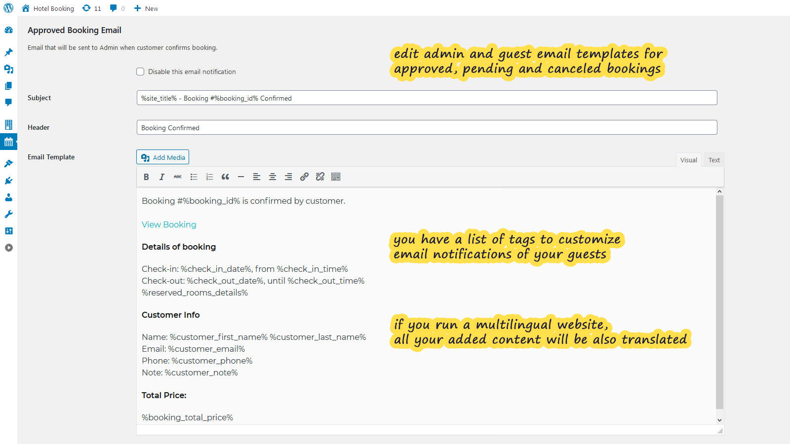 Edit admin and guest email templates for approved, pending and canceled bookings.