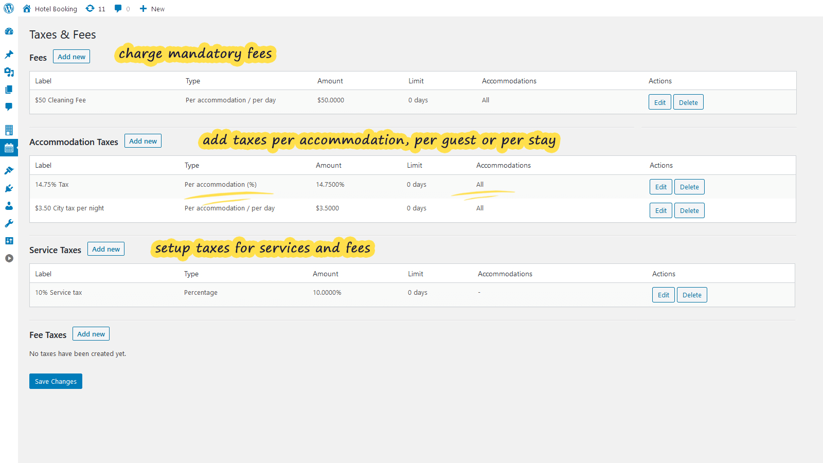 - Taxes and fees info: you can add mandatory fees, accommodation taxes, service taxes, and fee taxes to the accommodation rate.